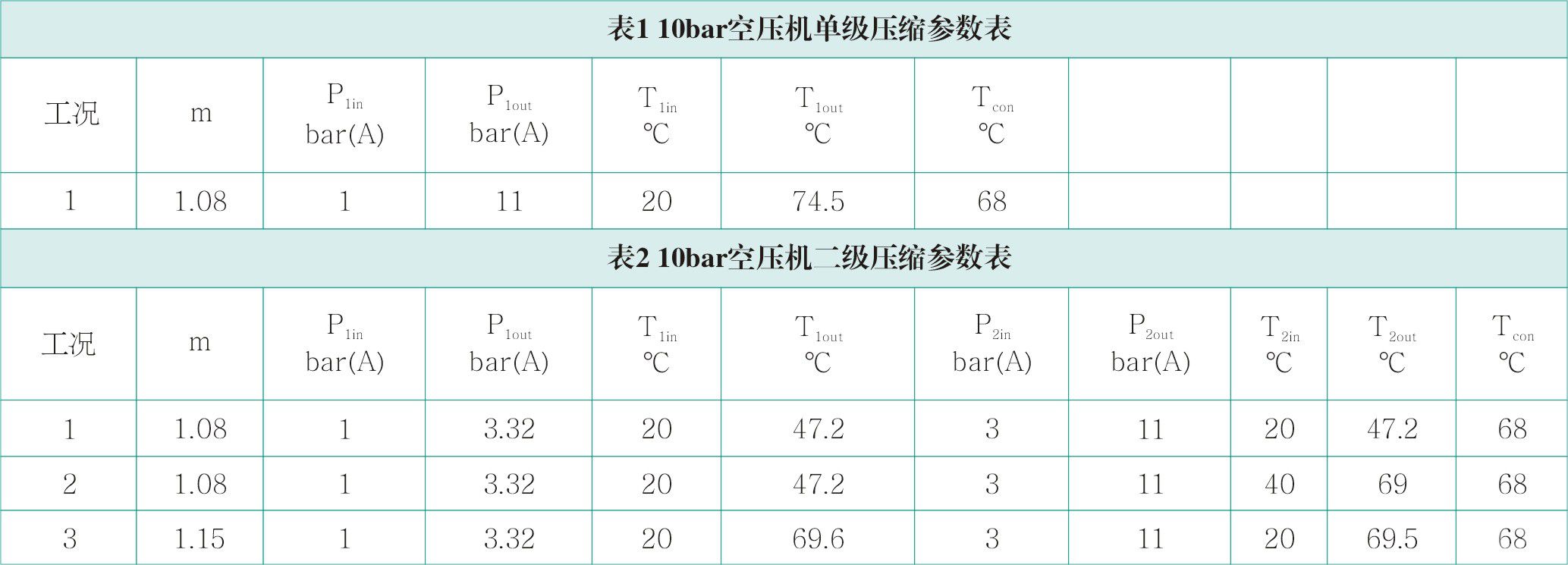 表2中m表示多变指数,P表示压力,T表示温度,in表示进气,out表示排气,1表示一级,2表示二级。A表示绝对压力。