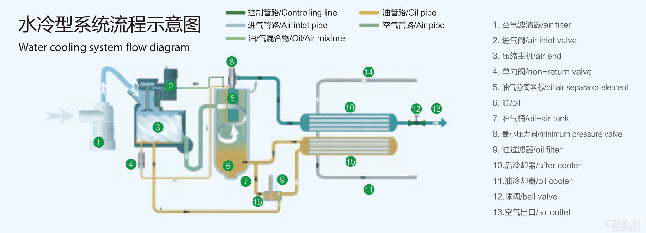 对于空压机润滑油冷却器来说,水冷型螺杆空压机如果缺水会使润滑油得不到很好的冷却,空压机润滑油的温度提高。这样,轻则使润滑油的粘度下降,润滑性能变差,运动部件磨损加剧,增加功耗,降低压缩机的使用寿命;重则会使润滑油分解,油中易挥发组分混入空气中,引起一系列事故的发生。